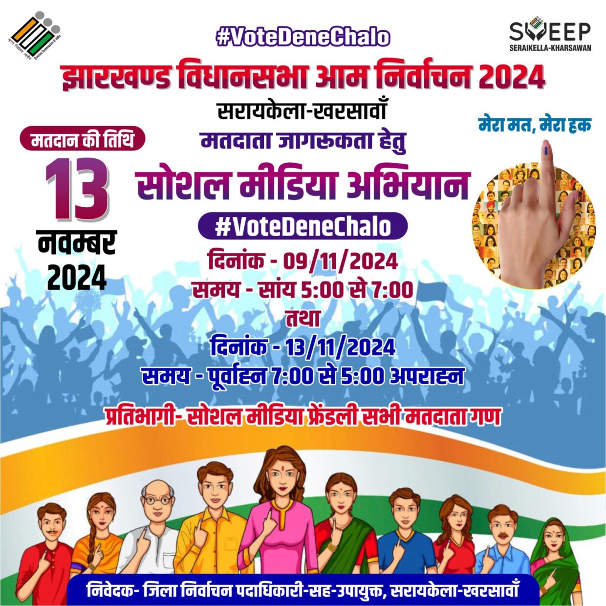 सरायकेला : विधानसभा आम निर्वाचन 2024 को लेकर 09, 13 व 20 नवंबर 2024 को मतदाता जागरुकता के लिए सोशल मीडिया पर हैशटैग #VoteDeneChalo (वोट देने चलो) अभियान चलाया जायेगा। जिला निर्वाचन पदाधिकारी सह उपायुक्त श्री रविशंकर शुक्ला ने बताया कि विधानसभा आम निर्वाचन में मतदान प्रतिशत में वृद्धि एवं मतदाता जागरुकता के निमित्त #VoteDeneChalo अभियान के प्रथम दिन 09 नवंबर को संध्या 5:00 बजे से 07:00 बजे तक चलाया जाना है। जिलांतर्गत सभी सरकारी कार्यालयों, सभी महाविद्यालयों, विश्वविद्यालयों, उच्च विद्यालयों, सभी कोचिंग संस्थानों, सभी व्यवसायिक संगठनों, सभी बूथ अवेयरनेस ग्रुप, सभी कार्यालयों में गठित वोटर अवेयरनेस फोरम के सदस्यों, कारखानों एवं अन्य प्रतिष्ठानों, संस्थानों के माध्यम से #VoteDeneChalo