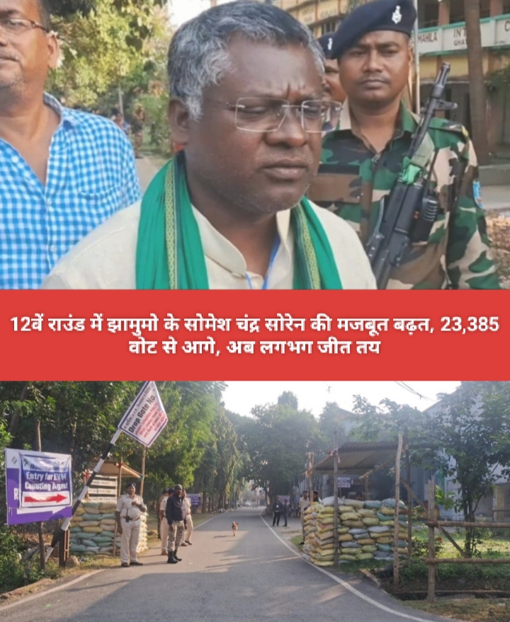 Saraikela (संजीव मेहता) : घाटशिला उप चुनाव का मतगणना जारी है. यहां 12वें राउंड में झामुमो के सोमेश चंद्र सोरेन की मजबूत बढ़त बन चुकी है. झामुमो प्रत्याशी अभी 23,385 वोट से आगे चल रहे हैं जिससे अब उनका जीत लगभग तय माना जा रहा है. बता दें कि घाटशिला विधानसभा उपचुनाव की मतगणना में झामुमो प्रत्याशी लगातार बढ़त बनाते हुए आ रहे हैं.
