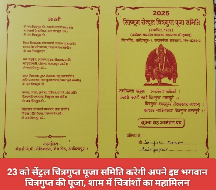 Saraikela (संजीव मेहता) : 23 अक्टूबर को सेंट्रल चित्रगुप्त पूजा समिति पान दुकान शिव मंदिर कमेटी अपने इष्ट भगवान चित्रगुप्त की पूजा अर्चना धूमधाम से करेगी. दिन में पूजा व महाप्रसाद वितरण होगा जबकि शाम में चित्रांशों का पारिवारिक महामिलन समारोह आयोजित होगा. यह जानकारी चित्रांश सदाशिव सिन्हा ने दी. बता दें कि यह कमेटी 1962 से चित्रगुप्त पूजन का आयोजन करती आ रही है.