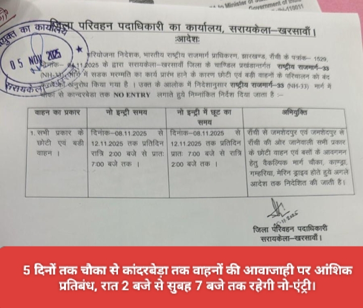 Saraikela (संजीव मेहता) : राष्ट्रीय राजमार्ग-33 (एनएच-33) पर चौका से कांदरबेड़ा तक आने-जाने वाले छोटे और बड़े वाहनों की आवाजाही आगामी 8 नवंबर से 12 नवंबर तक आंशिक रूप से प्रतिबंधित रहेगी. यह आदेश जिला परिवहन पदाधिकारी (डीटीओ) गिरिजा शंकर महतो ने जारी किया है. डीटीओ ने बताया कि भारतीय राष्ट्रीय राजमार्ग प्राधिकरण (एनएचएआई) द्वारा इस मार्ग पर सड़क मरम्मत और निर्माण कार्य तेजी से किया जा रहा है.