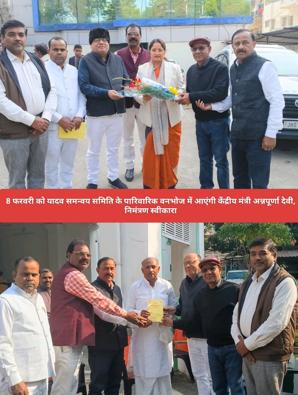 Saraikela (संजीव मेहता) : 8 फरवरी 2026 को यादव समन्वय समिति के पारिवारिक वनभोज में केंद्रीय मंत्री अन्नपूर्णा देवी शिरकत करेंगी. उन्होंने निमंत्रण स्वीकार लिया है. यादव समन्वय समिति के प्रतिनिधिमंडल द्वारा भारत सरकार की केंद्रीय मंत्री अन्नपूर्णा देवी एवं झारखंड विधानसभा के अध्यक्ष रविंद्र नाथ महतो से शिष्टाचार भेंट कर उन्हें निमंत्रण सौंपा गया है. कार्यक्रम में झारखंड सरकार के श्रम एवं उद्योग मंत्री संजय प्रसाद यादव, राजद झारखंड प्रदेश अध्यक्ष संजय कुमार सिंह यादव, झारखंड पिछड़ा वर्ग आयोग के अध्यक्ष जानकी प्रसाद यादव, साधु यादव,राजद युवा प्रदेश अध्यक्ष रंजन सिंह, बांका के सांसद गिरधारी यादव, पूर्व विधायक ललित यादव, राजद झारखंड के प्रवक्ता कैलास यादव, राजद की उपाध्यक्ष सह संसदीय समिति के सदस्य गिरधारी गोप सहित राज्य के कई वरीय पुलिस पदाधिकारी, प्रशासनिक अधिकारी एवं गणमान्य व्यक्तियों को आमंत्रित किया गया है.
