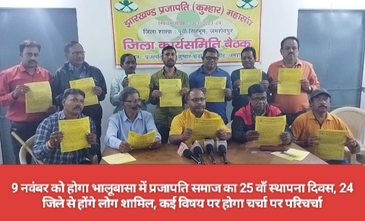 जमशेदपुर : झारखंड प्रजापति महासंघ पूर्वी सिंहभूम की ओर से बाराद्वारी स्थित प्रजापति भवन में प्रेस कंप्रेस आयोजित की गई, जिसमें महासंघ की अध्यक्ष तीतर प्रजापति ने पत्रकारों को जानकारी देते हुए बताया कि, 9 नवंबर को महासंघ के द्वारा 25वां स्थापना दिवस का आयोजन भालूबासा शीतला मंदिर में किया जा रहा है, जिसमें झारखंड के 24 जिला से प्रजापति समाज के लोग शामिल होंगे।