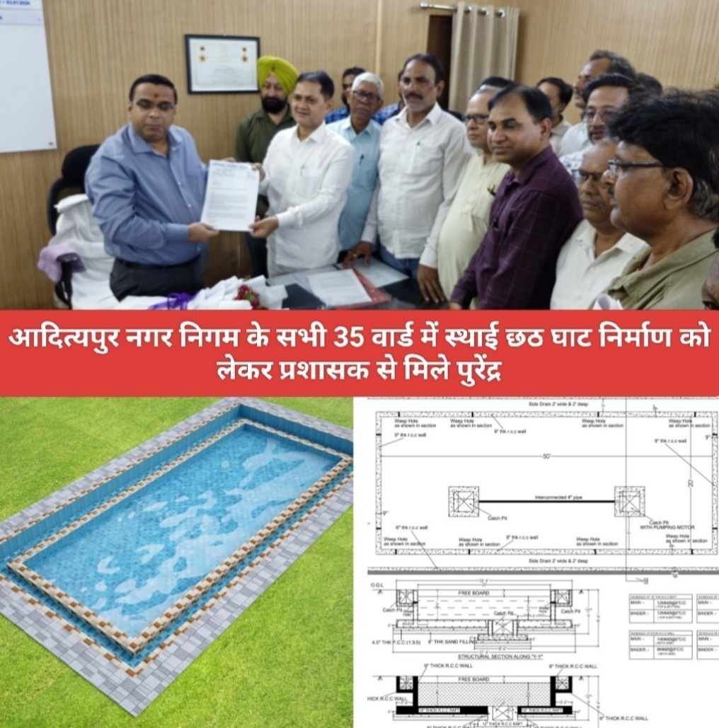 Saraikela (संजीव मेहता) : आदित्यपुर नगर निगम अंतर्गत सभी 35 वार्ड में स्थाई छठ घाट( डीप बोरिंग या जल स्रोत के निकट) के निर्माण की मांग को लेकर आदित्यपुर- गम्हरिया विकास समिति का एक प्रतिनिधिमंडल आदित्यपुर नगर परिषद के पूर्व उपाध्यक्ष पुरेंद्र नारायण सिंह के नेतृत्व में आदित्यपुर नगर निगम के प्रशासक श्री रवि प्रकाश से मिलकर एक ज्ञापन सौपा.पुरेंद्र नारायण सिंह ने स्थानीय प्रतिष्ठित आर्किटेक्ट द्वारा निर्मित एक मॉडल छठ घाट का ड्राइंग, डिजाइन, मटेरियल एस्टीमेट की कॉपी भी सुविधा के लिए प्रशासक आदित्यपुर नगर निगम को सौंपा. पुरेंद्र नारायण सिंह ने प्रशासक को बतलाया कि आदित्यपुर नगर निगम की कुल आबादी लगभग 2.5 लाख है. 50000 से ज्यादा हाउसहोल्ड है. नगर निगम क्षेत्र तीन तरफ से खरकई नदी से घिरा हुआ है. खरकाई नदी में आदित्यपुर तरफ नदी का चौड़ा पाट (बेड) है, जहां छठव्रती माता बहन बड़ी संख्या में छठ व्रत करती हैं.