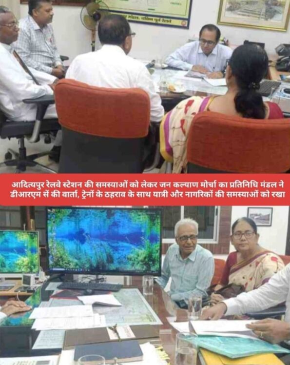 इसलिए उक्त ट्रेन को बिल्कुल सही समय पर चलाने की भी मांग रखी गई. वार्ता के दौरान डी आर एम ने खुद ही आदित्यपुर रेलवे स्टेशन पर एक्सेलेटर लगाने की भी बात कहीं. उन्होंने सभी मुद्दों पर अपने स्तर से सकारात्मक कार्रवाई करने का आश्वासन दिया. आज की बैठक में डीआरएम तरुण कुमार, सामाजिक संगठन जन कल्याण मोर्चा के अध्यक्ष एवं अधिवक्ता ओम प्रकाश, मोर्चा की उपाध्यक्ष लिली दास, मोर्चा के उपाध्यक्ष देवांग चंद मुखी, कार्यकारिणी सदस्य मदन सिंह, सुशांत जी शामिल थे.