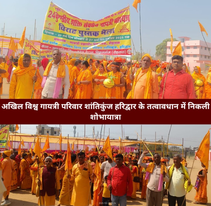 बिक्रमगंज (रोहतास) : सोमवार को अखिल विश्व गायत्री परिवार शांतिकुंज हरिद्वार के तत्वावधान में 24 कुंडीय शक्ति संवर्धन गायत्री महायज्ञ एवं विराट पुस्तक मेला का शोभायात्रा बड़े ही धूमधाम से बिक्रमगंज के सभी मार्गों से होते हुए काशी घाट पहुंचा । जहां वैदिक विधि विधान से जलभरी का कार्यक्रम काव नदी के पावन तट पर संपन्न हुआ । शोभा यात्रा के क्रम में गायत्री महामंत्र का संगीत छठ धुन में बज रहा था,जो बड़ा ही मनभावन दृश्य उपस्थित कर रहा था ।