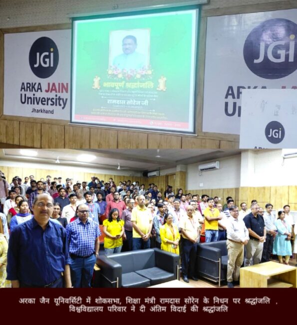 जमशेदपुर : अरका जैन यूनिवर्सिटी में शनिवार को आयोजित शोकसभा में झारखंड सरकार के स्कूली शिक्षा एवं साक्षरता तथा निबंधन विभाग के मंत्री रामदास सोरेन के निधन पर गहरा शोक व्यक्त किया गया। इस अवसर पर विश्वविद्यालय परिवार ने दिवंगत मंत्री के योगदान और उनकी सादगीपूर्ण छवि को याद किया।