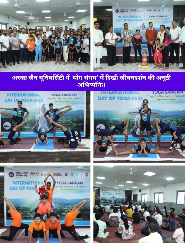 जमशेदपुर : लौहनगरी के प्रतिष्ठित शिक्षण संस्थान अरका जैन यूनिवर्सिटी में शनिवा को अंतर्राष्ट्रीय योग दिवस समारोहपूर्वक मनाया गया। इस अवसर पर “योग संगम” कार्यक्रम का भव्य आयोजन किया। यह आयोजन राष्ट्रीय सेवा योजना (एनएसएस) के अंतर्गत भारत सरकार के आयुष मंत्रालय के दिशा-निर्देशों पर आधारित था, जिसका उद्देश्य “एक पृथ्वी, एक स्वास्थ्य” की अवधारणा को जीवन में उतारना था।