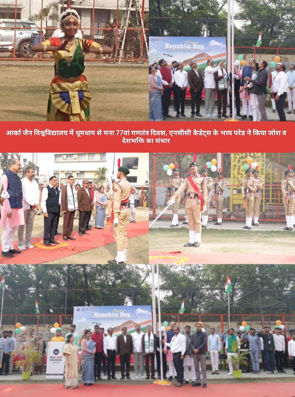 जमशेदपुर : आर्का जैन विश्वविद्यालय में 77वां गणतंत्र दिवस अत्यंत हर्षोल्लास, अनुशासन एवं देशभक्ति की भावना के साथ मनाया गया। इस अवसर पर पूरा विश्वविद्यालय परिसर तिरंगे से पटा और देशभक्ति गीतों से गुंजायमान रहा। समारोह का शुभारंभ विश्वविद्यालय के प्रांगण में ध्वजारोहण के साथ हुआ। इसके बाद एनसीसी (NCC) कैडेट्स ने एक गौरवपूर्ण एवं अनुशासित परेड प्रस्तुत की। कैडेट्स के शानदार प्रदर्शन ने उपस्थित सभी लोगों में जोश और देशभक्ति का संचार किया।