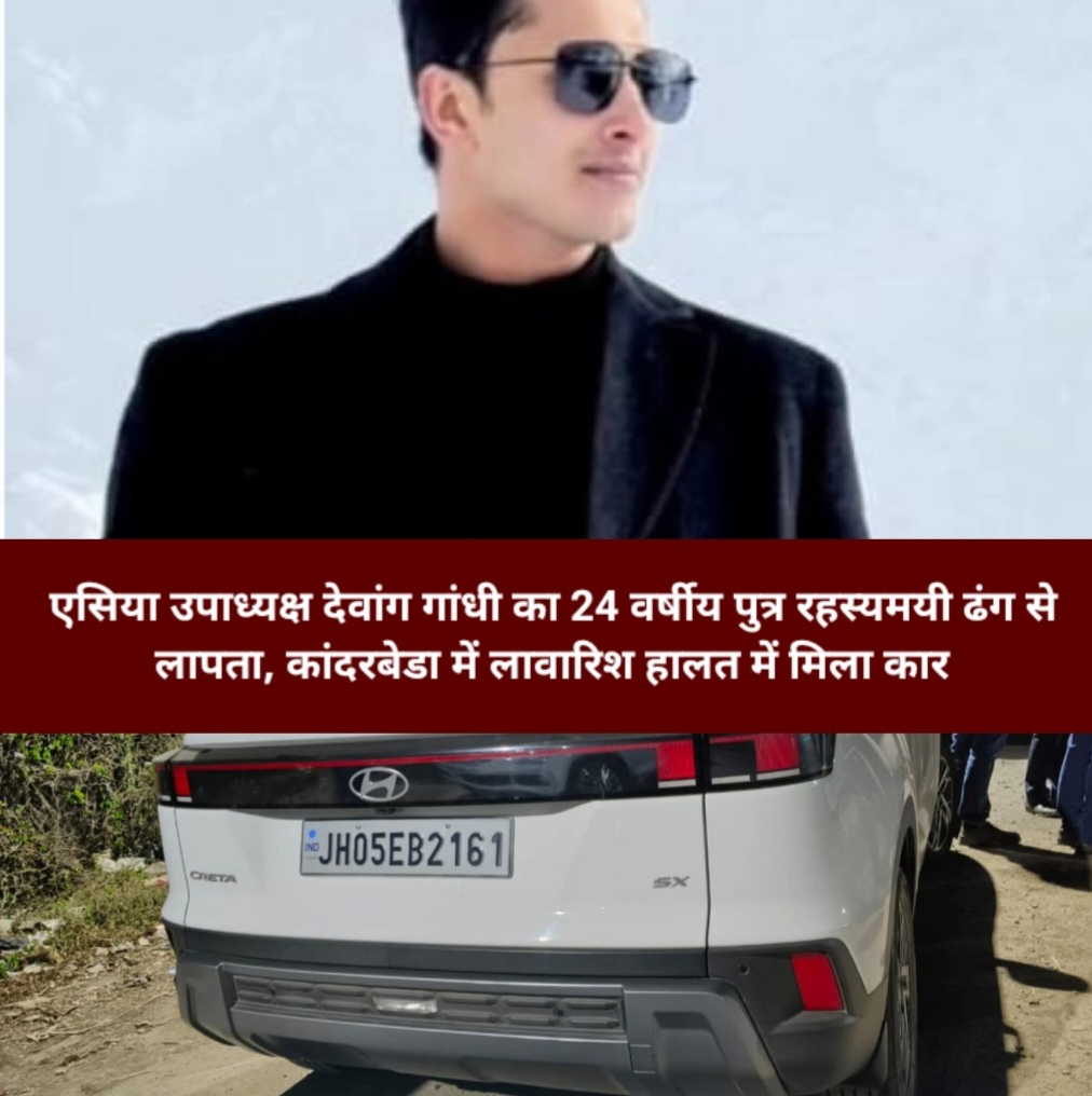सरायकेला (संजीव मेहता) : बिष्टुपुर सीएच एरिया निवासी और शहर के जाने-माने उद्यमी सह उद्यमी संगठन एसिया के उपाध्यक्ष देवांग गांधी के 24 वर्षीय पुत्र कैरव गांधी मंगलवार दोपहर करीब दो बजे से रहस्यमय परिस्थितियों में लापता हो गए हैं. युवक के अचानक गायब होने से न सिर्फ गांधी परिवार, बल्कि शहर के कारोबार जगत में भी हड़कंप मच गया है. पुलिस सूत्रों के अनुसार कैरव गांधी का अंतिम मोबाइल लोकेशन सोनारी थाना क्षेत्र के आदर्श नगर इलाके में ट्रेस किया गया था. इसके बाद उनकी क्रेटा कार पड़ोसी जिला सरायकेला-खरसावां के चांडिल थाना क्षेत्र अंतर्गत कांदरबेड़ा के पास झाड़ियों से बरामद की गई है. कार मिलने के बाद मामला और भी गंभीर हो गया है.