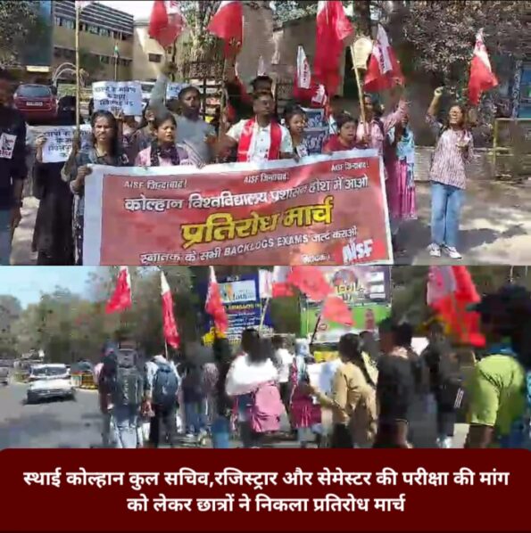 जमशेदपुर : कोल्हन विश्वविद्यालय में स्थाई कुलसचिव और रजिस्ट्रार की नियुक्ति के अलावा सेमेस्टर की परीक्षा आयोजित करने की मांग को लेकर ऑल इंडिया स्टूडेंट फेडरेशन के बैनर तले छात्रों ने प्रतिरोध मार्च निकाल कर उपायुक्त कार्यालय के समक्ष प्रदर्शन किया। यह प्रतिरोध मार्च आम बागान मैदान से आरंभ होकर जिले के उपायुक्त कार्यालय के समक्ष पहुंचे,जहां प्रदर्शन कर अपनी मांगों को रखते हुए कहा कि कोल्हन विश्वविद्यालय में अस्थाई तौर पर कुल सचिव और रजिस्ट्रार नियुक्त है.उस पद को अभिलंब स्थाई नियुक्त किया जाए, वही UG के सत्र 2020-23 और 21 – 24 के सेमेस्टर 1, 3 ,4, 5, 6 की परीक्षा अभिलंब आयोजित की जाए।