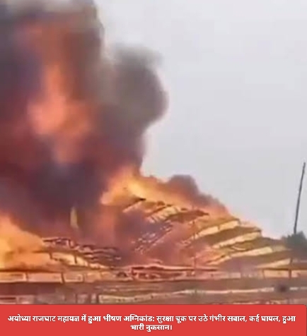 रांची : अयोध्या के राजघाट क्षेत्र में आयोजित लक्ष्मी नारायण महायज्ञ के अंतिम दिन शनिवार को अचानक भयंकर आग भड़क उठी। इस हादसे के पीछे की वजह अभी स्पष्ट नहीं हो सकी है। प्रत्यक्षदर्शियों का कहना है कि इस दुर्घटना में भारी आर्थिक क्षति हुई है, जिसका अनुमान लाखों रुपये तक लगाया जा रहा है।