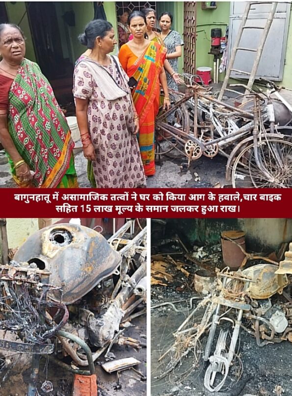 जमशेदपुर : जमशेदपुर के सिदगोड़ा थाना अंतर्गत बागुनहातू में बीती देर रात असामाजिक तत्वों के द्वारा एक घर को आग के हवाले कर दिया। जिसमें 15 लाख से ज्यादा सामने जलकर राख हो गई। घटना के बारे में परिवार वालों ने बताया कि बीती रात दो से 3 बजे के करीब घर के सभी सदस्य सो रहे थे। इसी बीच बाहर से कुछ लोगों ने पत्थर फेंक कर उन्हें जगाया, उठने पर देखा कि आंगन में आग लगी हुई है और वहां रखें चार बाइक, तीन साइकिले, अलमारी सोफा सेट, पेंटिंग का सामान के अलावे बाथरूम धू धू कर जल रही है।