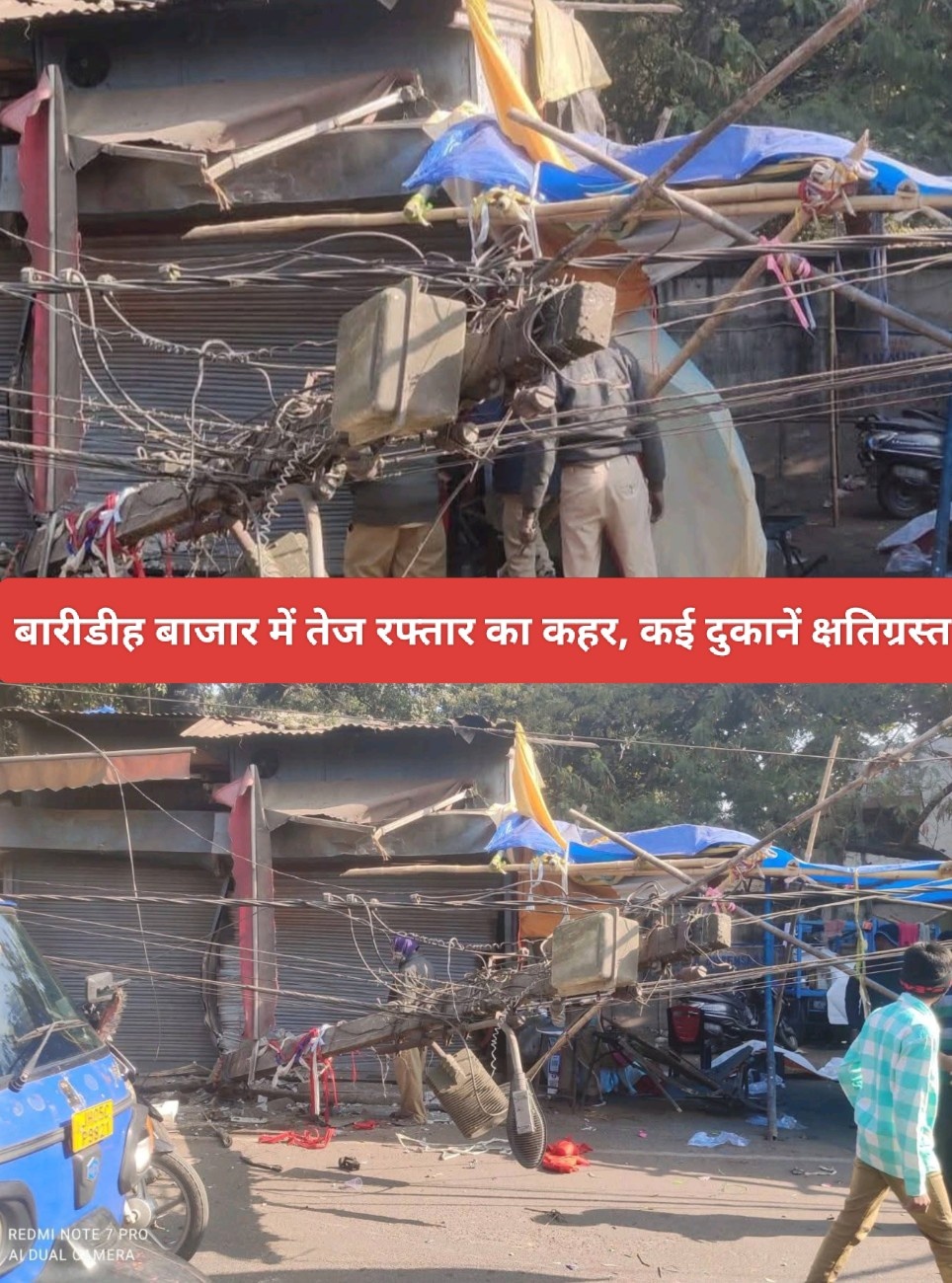 Saraikela (संजीव मेहता) : जमशेदपुर के बारीडीह बाजार में बीती रात एक अनियंत्रित अज्ञात वाहन ने भारी तबाही मचाई है. तेज रफ्तार वाहन एक दुकानों में जा घुसा. जिससे कई दुकानें पूरी तरह टूट गईं और बिजली का पोल भी क्षतिग्रस्त हो गया है.