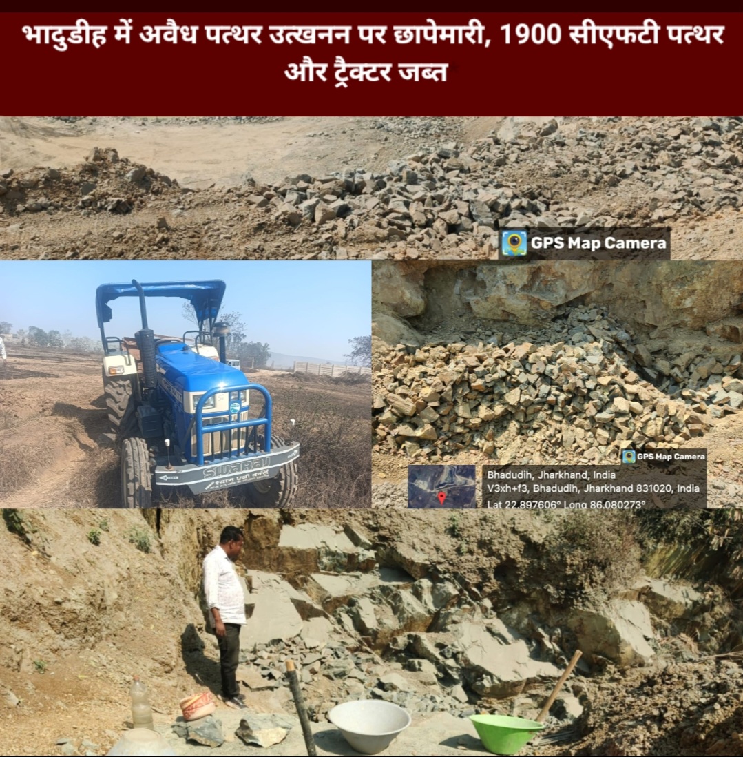 चांडिल : जिला खनन विभाग और चांडिल थाना पुलिस ने संयुक्त अभियान चलाकर मौजा भादुडीह में अवैध पत्थर उत्खनन और भंडारण पर बड़ी कार्रवाई की। इस छापेमारी में विभिन्न स्थानों से करीब 1900 सीएफटी अवैध रूप से संग्रहित पत्थर जब्त किए गए। इसके अलावा, अवैध रूप से पत्थर लदे एक ट्रैक्टर को भी जब्त किया गया। इस कार्रवाई में खनन विभाग, चांडिल थाना प्रभारी एवं अन्य सशस्त्र बल शामिल रहे। टीम ने इलाके में गहन जांच-पड़ताल की और अवैध खनन से जुड़े कई अहम साक्ष्य जुटाए। प्रशासन का कहना है कि अवैध खनन न केवल पर्यावरण को नुकसान पहुंचा रहा है, बल्कि सरकार के राजस्व को भी भारी क्षति हो रही है।