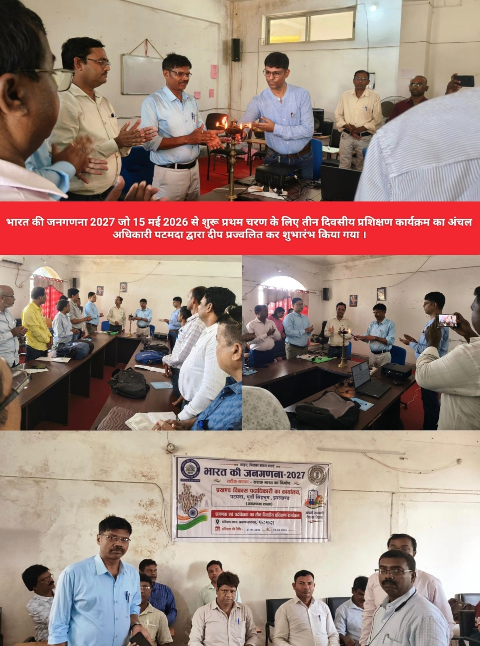 जमशेदपुर: जमशेदपुर जिले के पटमदा प्रखंड कार्यालय में भारत की जनगणना 2027 जो 15 मई 2026 से शुरू प्रथम चरण के लिए तीन दिवसीय प्रशिक्षण कार्यक्रम का अंचल अधिकारी पटमदा राजेंद्र दास द्वारा दीप प्रज्वलित कर शुभारंभ किया गया । इस अवसर पर अंचलाधिकारी द्वारा दीप प्रज्वलित कर कार्यक्रम की विधिवत शुरुआत की गई। प्रशिक्षण सत्र में जनगणना के महत्व और उसके विभिन्न आयामों पर विस्तार से चर्चा की गई, जिसमें जनसंख्या, लिंगानुपात, आयु संरचना, धर्म, आर्थिक गतिविधियाँ, आवास, प्रवासन तथा परिसीमन जैसे विषय प्रमुख रूप से शामिल रहे।