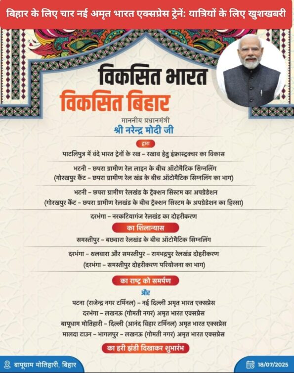 बिहार : पूर्व मध्य रेलवे ने यात्रियों की सुविधा के लिए 04 नई अमृत भारत एक्सप्रेस ट्रेनों का परिचालन शुरू करने की घोषणा की है। इन ट्रेनों का उद्घाटन माननीय प्रधानमंत्री श्री नरेन्द्र मोदी जी द्वारा 18 जुलाई 2025 को किया जाएगा।