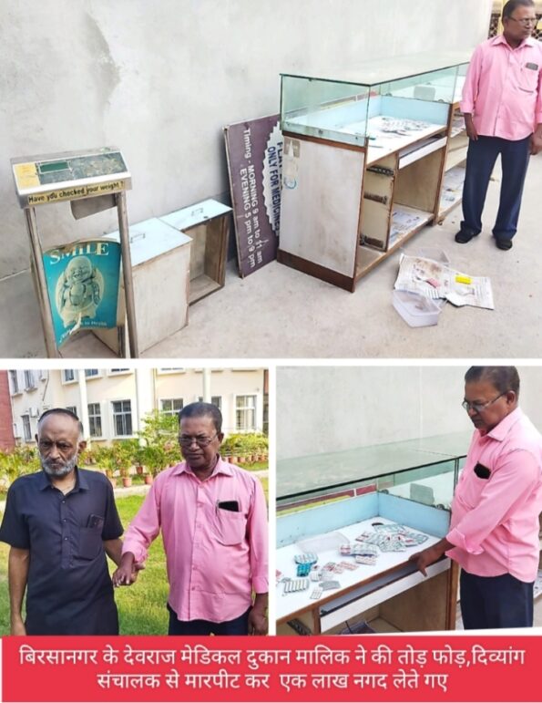 पीड़ित दिव्यांग निर्मलेंदु मिर्धा ने जानकारी देते हुए बताया कि 2011 से मेडिकल दुकान चला रहे हैं, दुकान लेते समय दुकान मालिक पंकज कच्छप ने 80 हजार रुपए एडवांस के तौर पर जमा भी लिए, लेकिन फरवरी माह में अचानक पंकज ने दुकान खाली करने को कहा जिस पर उन्होंने 15 वर्षों से दुकान चलाने का हवाला देते हुए दुकान खाली नहीं करने की बात कही, जिसे लेकर लगातार दुकान मालिक द्वारा दवाब दिया जा रहा था, जिस वजह से निर्मलेंदु ने अप्रैल माह में कोर्ट में केस फाइल कर दी। जिससे नाराज होकर पंकज कच्छप ने गुरुवार को 20-25 लोगों के साथ दोपहर 1:00 बजे दुकान पहुंचे और बिना कुछ कहे दुकान में तोड़फोड़ करने लगे और उसे दुकान के समीप मैरिज हॉल में लेकर गए जहां उसके साथ मारपीट करते हुए सादे कागज में हस्ताक्षर करवा लिए, उसके बाद दुकान में रखें फर्नीचर और दवाओं को दुकान के बाहर निकाल दिया,वहीं कुछ सामानों को उसके घर पहुंचा दिया तो कुछ सामानों को दूसरे जगह फेंक कर चल गए । जिससे 30 लाख मूल्य का समान का नुकसान हुआ है जिसमें पेमेंट के लिए रखे एक लाख नगद भी नदारत है संभवत पंकज उस पैसे को अपने साथ लेते गए। घटना के बाद पीड़ित ने बिरसानगर थाना में पंकज के खिलाफ मामला दर्ज कराया है, वहीं पुलिस शिकायत के आलोक में पूरे मामले की जांच में जुट गई है।