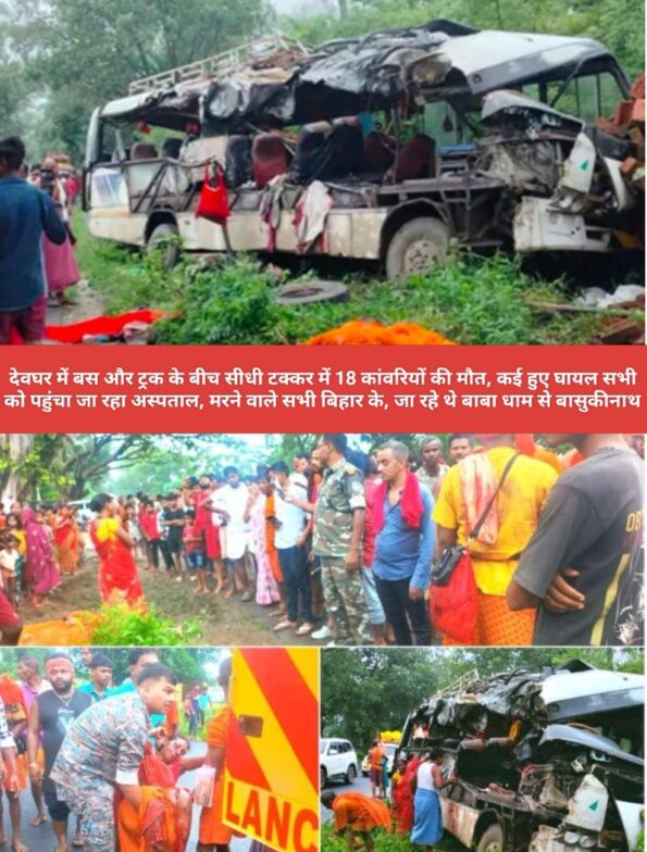 देवघर (संदीप कुमार ) : देवघर में एक भीषण सड़क हादसे में 18 कांवड़ियों की जान चली गई, जबकि कई अन्य गंभीर रूप से घायल हो गए। हादसा मंगलवार तड़के 5 बजे के करीब मोहनपुर थाना क्षेत्र के जमुनिया इलाके में हुआ, जब कांवड़ियों से भरी बस देवघर से बासुकीनाथ की ओर जा रही थी। इसी दौरान सामने से आ रहे एक ट्रक से बस की जोरदार टक्कर हो गई, जिसमें एलपीजी सिलेंडर लदे थे।