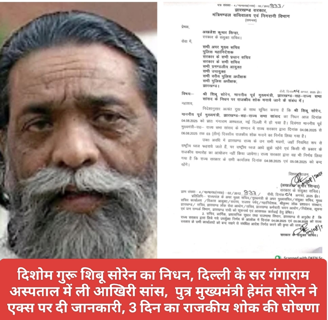 दिशोम गुरू के निधन की जानकारी CM हेमंत सोरेन ने अपने आधिकारिक सोशल मीडिया X पर साझा की है. उन्होंने लिखा… “आदरणीय दिशोम गुरुजी हम सभी को छोड़कर चले गए हैं. आज मैं शून्य हो गया हूँ…”.