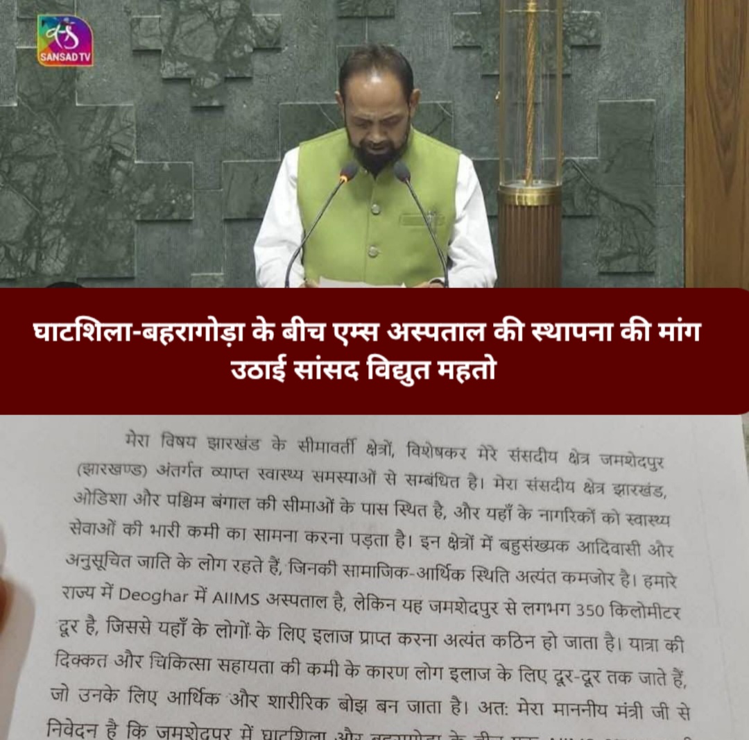 सरायकेला: (संजीव मेहता) : जमशेदपुर का प्रतिनिधित्व करते हुए आज संसद भवन में घाटशिला और बहरागोड़ा के बीच एक एम्स (AIIMS) अस्पताल की स्थापना की माँग सांसद विद्युत वरण महतो ने रखीहै. उन्होंने बताया कि यह माँग केवल झारखंड ही नहीं, बल्कि ओडिशा और पश्चिम बंगाल के सीमावर्ती क्षेत्रों में रहने वाले लोगों की स्वास्थ्य से जुड़ी गंभीर समस्याओं को ध्यान में रखकर की गई है.