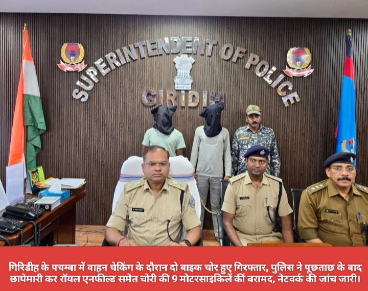 गिरिडीह : गिरिडीह पुलिस अधीक्षक डॉ. बिमल कुमार को गुप्त सूचना मिली थी कि वाहन चोरी में संलिप्त कुछ अपराधी गिरिडीह जिले में सक्रिय होकर घूम रहे हैं। सूचना के आधार पर एसपी के निर्देश पर पचम्बा थाना क्षेत्र में विशेष एंटी क्राइम वाहन चेकिंग अभियान चलाया गया। इसी दौरान बनखजो पुल के पास वाहन जांच के दौरान एक बाइक पर सवार दो युवक पुलिस को देखकर मोटरसाइकिल छोड़कर भागने लगे।