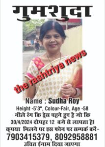 नाम- सुधा राय उम्र-58 वर्ष, पति- रमेश राय, पता- जोन नंबर -03,B दिनांक 30 अप्रैल 2024 को दोपहर 12:30 बजे से अपने घर ब्लॉक, थाना- बिरसानगर, जमशेदपुर की रहने वाली है, जो दिनांक 30/04/24 को दोपहर 12:30 बजे से अपने घर से पैसा बाकी लाने के बहाने निकल कर कहीं चली गई है। जो अभी तक अपने घर वापस नहीं आई है | गुम हुए महिला का हुलिया निम्न प्रकार है:-