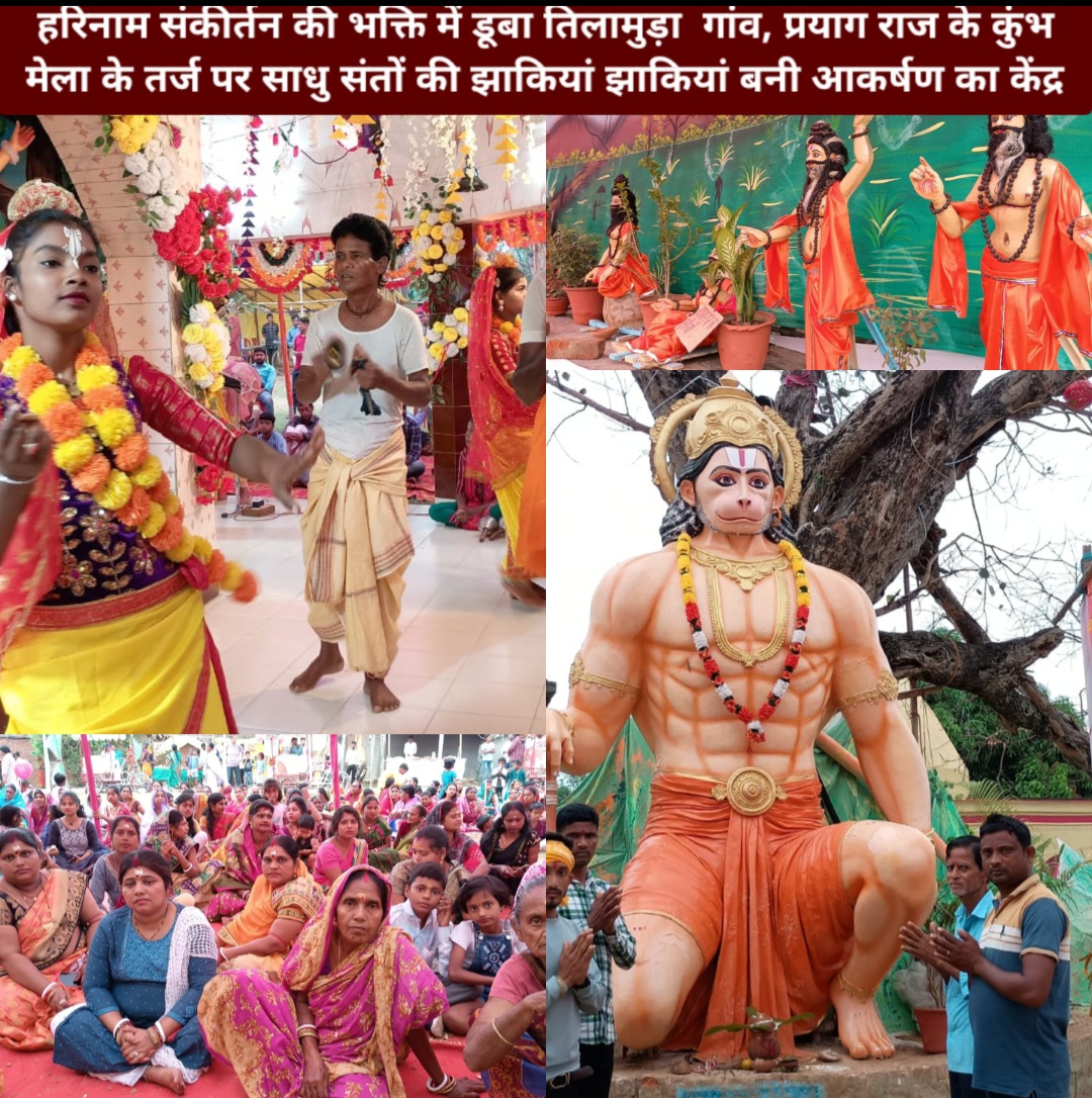 जादूगोड़ा : हरिनाम संकीर्तन से जादूगोड़ा का तिलामुड़ा गांव भक्ति_ भाव में डूब गया है व पूरा गांव।भक्तिमय हो गया हैं।यहां पांच फिट की बनी बजरंग बलि की।मूर्ति,राधा कृष्ण की झाकियां, प्रयागराज के कुंभ मेला की तर्ज साधु _ संतों की झाकियां लोगों के लिए आकर्षण का केंद्र बनी हुई है व लोग गांव के राधा_ कृष्ण मन्दिर की ओर रुख कर रहे हैं ।बांकुड़ा व देवरा ( पश्चिम बंगाल ) से आई महिला कीर्तन मंडली की हरिनाम संकीर्तन करते मनमोहक नृत्य माहौल में समा बांध दिया है।
