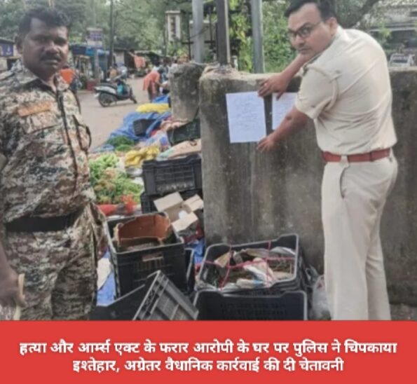 बता दें कि कल्पनापुरी स्थित नगर निगम कार्यालय के पास रहनेवाले राजेश सिंह का पुत्र सौरभ कुमार सिंह उर्फ कैटरीना आदित्यपुर थाना में आर्म्स एक्ट एवं हत्या के आरोप में वर्ष 2024 में दर्ज दो मामलों का नामजद अभियुक्त है, जो फरार चल रहा है. रविवार को मामलों के अनुसंधानकर्ता एसआइ जयराज कुमार सोनी एवं एसआइ सुनील कुमार सिंह ने कोर्ट द्वारा निर्गत इश्तेहार को आज डुगडुगी बजाकर उसके घर पर जाकर चिपकाया. इसके साथ ही क्षेत्र के सार्वजनिक स्थान, आदित्यपुर सब्जी बाजार में भी इश्तेहार की प्रति चिपकाई गई. दोनों पुलिस अधिकारियों ने सौरभ के इश्तेहार में दी समयावधि में सरेंडर नहीं करने की स्थिति में अग्रेतर वैधानिक कार्रवाई शुरू करने की चेतावनी भी दी है.