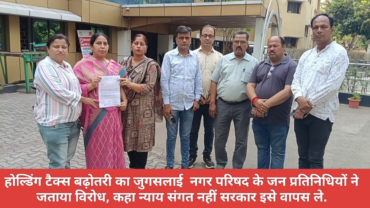 जबकि नगर परिषद क्षेत्र में नागरिक सुविधा बेहतर नहीं है वही गली और मोहल्ला के आधार पर समान आकार के भवनो पर अलग-अलग होल्डिंग टैक्स लागू किया गया है जो की वैज्ञानिक तौर पर न्याय संगत नहीं है. वैसे तो सरकार की ओर से 15 से 20% की विधि की गई है लेकिन जनता जब उसका मापदंड निकाल रही है तो उन्हें 2 गुना राशि देना निर्गत हो रहा है ऐसे में मध्यम वर्गीय परिवार और छोटे व्यापारियों को आर्थिक बोझ का सामना करना पड़ेगा. वही उपाध्यक्ष अर्चना दुबे ने कहा कि सरकार के इस तरह के टैक्स बढ़ोतरी किए जाने के कारण उन्हें क्षेत्र में जाकर काम करने में काफी कठिनाइयों का सामना करना पड़ रहा है जनता उनसे सवाल जवाब कर रही है ऐसे में विकास कार्य में बाधा उत्पन्न हो रही है इसलिए जुगसलाई नगर परिषद के सभी जनप्रतिनिधि सरकार से इस बढ़ाए गए टैक्स पर पूर्ण विचार कर इसे वापस लिया जाय.