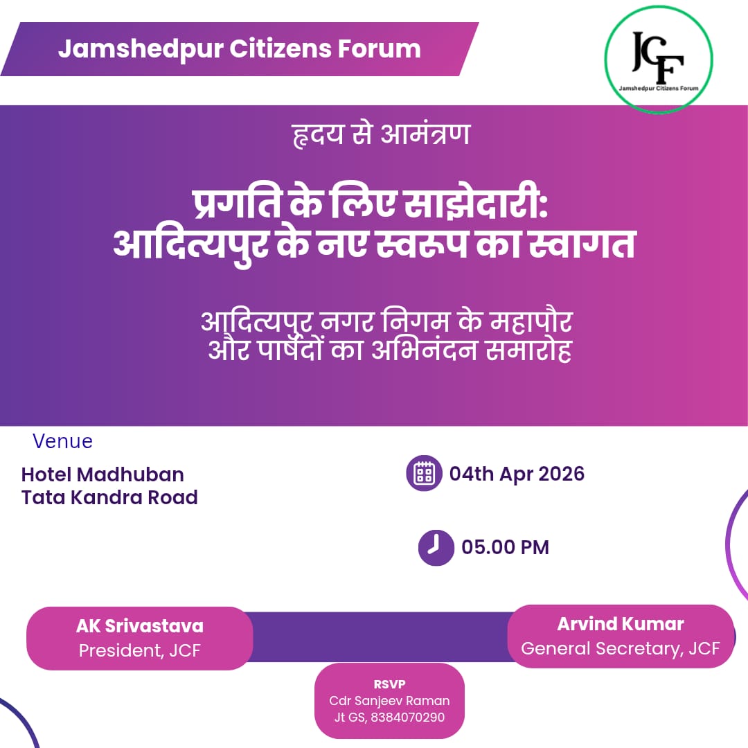 Saraikela (संजीव मेहता) : जमशेदपुर सिटीजंस फोरम के द्वारा आगामी 4 अप्रैल को मोटेल मधुबन में आदित्यपुर नगर निगम के नवोदित मेयर और पार्षदों का अभिनंदन समारोहपूर्वक करेगा. इस अभिनंदन समारोह की जानकारी फोरम के अध्यक्ष एके श्रीवास्तव और महासचिव पूर्व विधायक अरविंद कुमार सिंह ने दी. समारोह संध्या 5:00 बजे से आदित्यपुर स्थित मधुबन होटल में आयोजित किया गया है, जिसमें आदित्यपुर के सर्वांगीण विकास विषय पर एक गोष्ठी का भी आयोजन किया जाएगा.