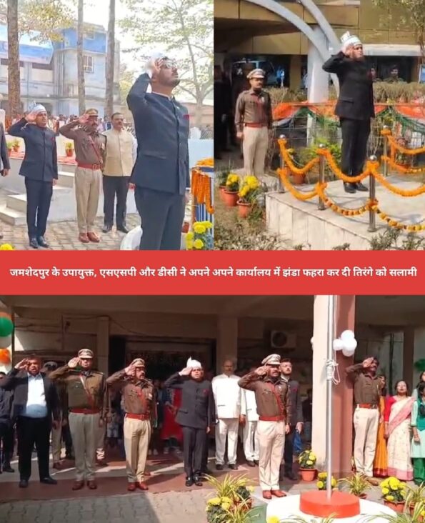 जमशेदपुर: 77वें गणतंत्र दिवस के अवसर पर पूर्वी सिंहभूम जिले के विभिन्न सरकारी कार्यालयों में तिरंगा फहराया गया। इस मौके पर जिले समाहरणालय परिसर में उपायुक्त कर्ण सत्यार्थी ने तिरंगा झंडा फहरा कर सलामी दी,इस दौरान एसएसपी पियूष पांडे सहित अन्य पदाधिकारी एवं विभिन्न स्कूलों के बच्चे मौजूद थे।