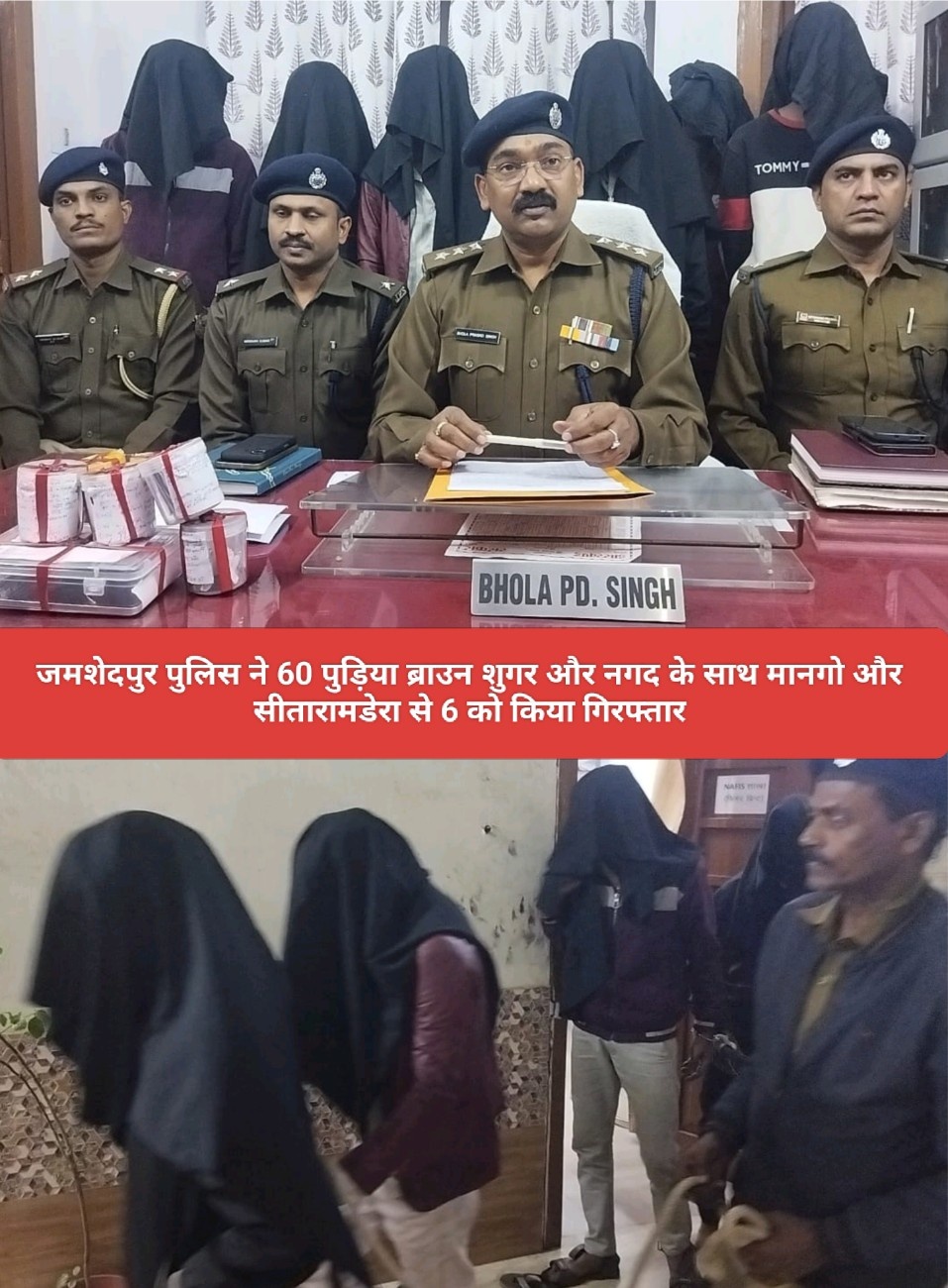 जमशेदपुर : जमशेदपुर के जिला पुलिस द्वारा मादक पदार्थों के खिलाफ चलाए जा रहे अभियान के तहत मानगों और सीतारामडेरा थाना क्षेत्र से 6 आरोपियों को 60 पुड़िया ब्राउन शुगर और साढ़े 7 हजार नगद के साथ गिरफ्तार किया है। इसे लेकर डीएसपी हेडक्वार्टर वन भोला प्रसाद ने प्रेस कॉन्फ्रेंस कर जानकारी देते हुए बताया कि बीती रात गुप्त सूचना मिली कि मानगो नदी किनारे दुर्गा मंदिर पुराना बाजार समिति के परिसर कुछ युवक संदिग्ध अवस्था में बैठे हुए है,जिसके बाद वहां किए गए छापामारी के दौरान वहां से 4 युवकों को हिरासत में लिया गया जिनकी तलाशी लेने पर उनके पास से 45 पुड़िया ब्राउन शुगर और 6650 नगद बरामद की गए पूछताछ में उनके द्वारा बताया गया कि यह पुड़िया अपने इस्तेमाल के लिए और बिक्री करने के लिए रखे हुए थे।