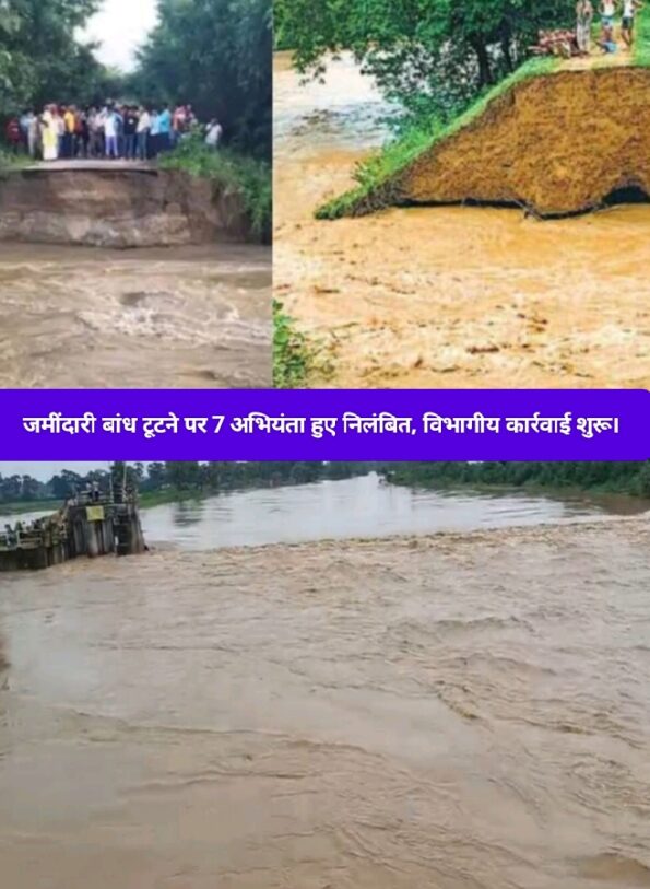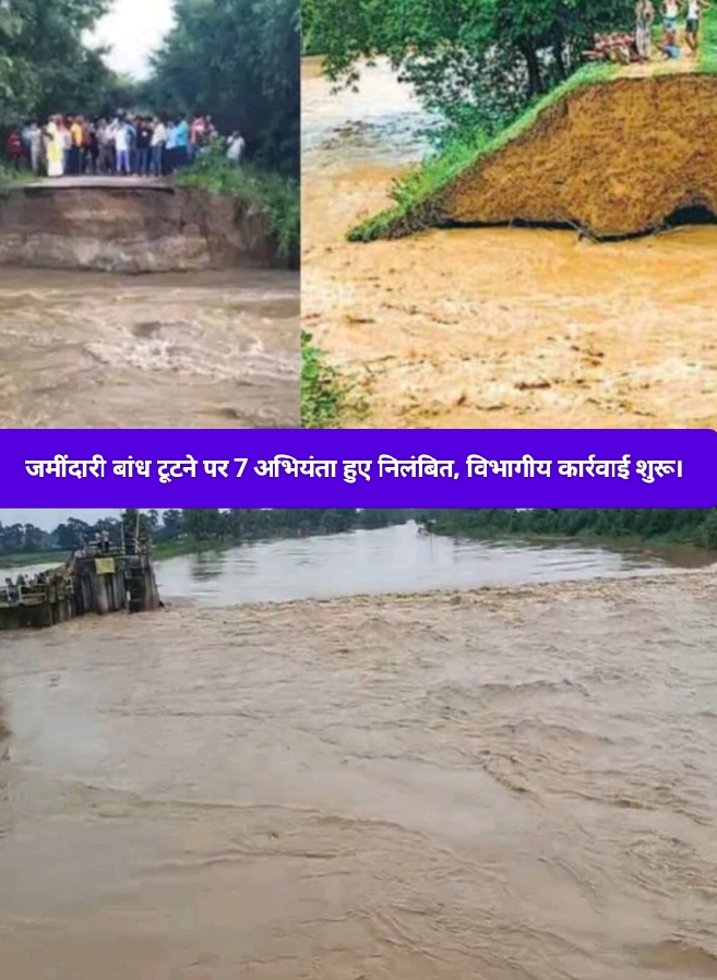 बिहार : नालंदा और जहानाबाद जिलों में भारी वर्षा के बाद जल स्तर में अप्रत्याशित वृद्धि के कारण 12 स्थानों पर जमींदारी बांध टूट गए। इस गंभीर स्थिति को देखते हुए जल संसाधन विभाग ने तत्काल कार्रवाई करते हुए एक कार्यपालक अभियंता सहित कुल सात अभियंताओं को सेवा से निलंबित कर दिया है। मंत्री विजय कुमार चौधरी ने बताया कि लापरवाही बरतने वालों के विरुद्ध अनुशासनात्मक कार्रवाई प्रारंभ की गई है।