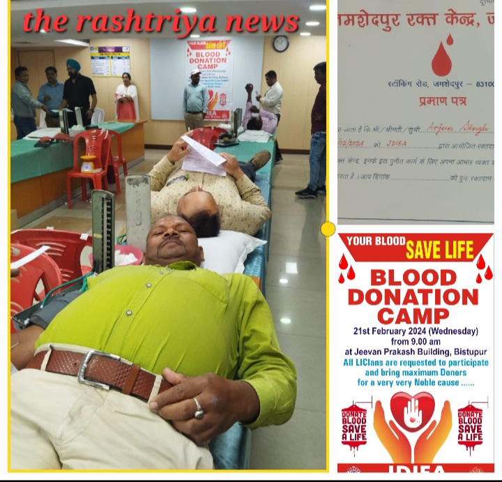 जहां रक्तदान कर हम दूसरे की जीवन बचाते हैं। वहीं दूसरी ओर इससे जबर्दस्त आत्म संतुष्टि मिलती है। रक्तदान से कई प्रकार के लाभ होते हैं। हम सभी को रक्तदान के लिए आगे आना चाहिए। जे डी आई इ ए संगठन की ओर से 37वां रक्तदान शिविर का आयोजन बिस्टुपुर स्थित जीवन बीमा कार्यालय में किया गया। जिसमें लगभग समाचार लिखे जाने तक यानी 4:50 मिनट तक 190 यूनिट रक्तदान हो चूका है,और रक्तदान जारी है। इस रक्तदान शिविर में वरिष्ठ मण्डल प्रबंधक श्री एस. के. पंडा, ऑल इंडिया एल आई सी फेडरेशन के महामंत्री श्री राजेश कुमार अर्जुन सिंह गिरीश ओझा सहित बड़ी संख्या में कर्मचारी, अधिकारी एवं रक्तदाता शामिल हूए।वही रक्तदान करने के लिए अर्जुन सिंह को प्रमाण पत्र दिया गया।
