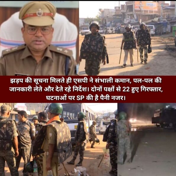 रांची:Giridih. झारखंड के गिरिडीह जिले में होली जुलूस के दौरान हुई झड़प में संलिप्त 22 लोगों को गिरफ्तार किया गया है. झड़प की सुचना मिलते ही गिरिडीह एसपी डॉक्टर विमल कुमार ने कमान संभालते हुए, पल-पल की सूचना लेते और देते रहे अधिकारियों को दिशा निर्देश । दोनों पक्षों से अभी तक 22 लोगों को गिरफ्तार किया गया है। गिरिडीह के घोड़थंबा इलाके में शुक्रवार को जुलूस के दौरान दो समूहों के बीच झड़प में कई लोग घायल हो गए और कई दुकानों और वाहनों को आग लगा दी गई थी. जिसे सूचना मिलते ही पुलिस अधीक्षक डॉ विमल कुमार ने घटनाओं पर पैनी नजर रखते हुए अधिकारियों के दिशा निर्देश देते रहे। खोरीमहुआ अनुमंडलीय पुलिस अधिकारी (एसडीपीओ) राजेंद्र प्रसाद ने ‘‘मामले में दोनों पक्षों से कुल 22 लोगों को गिरफ्तार किया है. बताया कि झड़प के दौरान चार अस्थायी दुकानें, पांच मोटरसाइकिलें और दो चार पहिया वाहन आग के हवाले कर दिए गए थे.