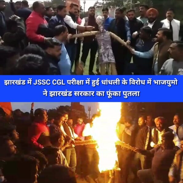 जमशेदपुर: झारखंड में JSSC CGL परीक्षा में हुई धांधली का मामले को लेकर भारतीय जनता युवा मोर्चा ने साकची जुबली पार्क गोल चक्कर में हेमंत सोरेन सरकार का पुतला फूंका।