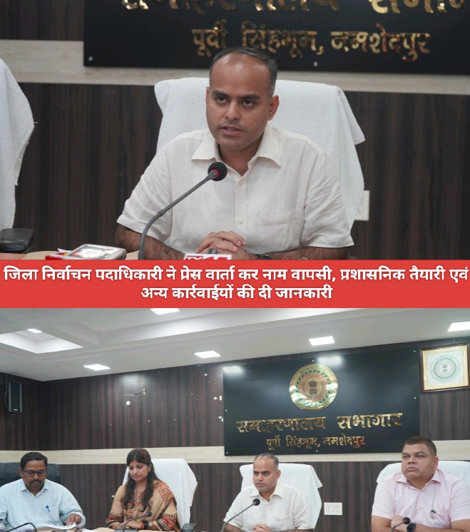 जमशेदपुर : 45-घाटशिला विधानसभा उपचुनाव को लेकर जिला निर्वाचन पदाधिकारी श्री कर्ण सत्यार्थी ने समाहरणालय सभागार में प्रेस प्रतिनिधियों को संबोधित किया । उन्होने बताया कि नाम वापसी के अंतिम दिन निर्दलीय प्रत्याशी विक्रम किस्कू ने अपना नामांकन वापस लिया, अब तेरह (13) अभ्यर्थी चुनावी मैदान में होंगे। निर्वाची पदाधिकारी द्वारा अब सभी 13 अभ्यर्थियों को सिंबल आवंटित किया जाएगा। विदित हो कि 45-घाटशिला (अ.ज.जा) उपचुनाव में कुल 17 अभ्यर्थियों (पुरूष-15, महिला-02) ने नाम निदेशित किया था, नामांकन संविक्षा उपरांत 3 नामांकन अस्वीकृत किए गए तथा नामांकन वापसी के अंतिम दिन एक अभ्यर्थी ने नामांकन वापस लिया।