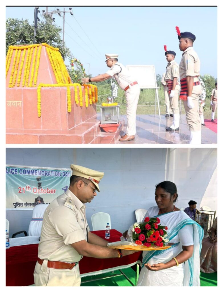 सरायकेला: जिला पुलिस केन्द्र परिसर में शहीद संस्मरण दिवस के अवसर पर पूरे भारतवर्ष में अपने कर्तव्य के दौरान शहीद हुए पुलिसकर्मियों की स्मृति में एक कार्यक्रम का आयोजन किया गया। इस मौके पर सर्वप्रथम शहीदों के सम्मान में शोक सभा कर सलामी दी गई। इसके बाद पुलिस केंद्र स्थित शहीद स्मारक पर लगे शहीदों की तस्वीरों पर पुलिस अधीक्षक डॉ0 विमल कुमार समेत अन्य वरीय पुलिस पदाधिकारियों, पुलिसकर्मियों, द्वारा शहीद पुलिस पदाधिकारियों व कर्मियों के परिजनों द्वारा रीट एवं पुष्प अर्पित कर उन्हें श्रद्धांजलि दी गई। इस मौके पर शहीद पुलिस पदाधिकारियों एवं पुलिसकर्मियों के परिजनों को बुके, शॉल, साड़ी और अन्य उपहार भेंटकर उन्हें सम्मानित किया गया। इस मौके पर पुलिस अधीक्षक डॉ0 विमल कुमार ने शहीदों के परिजनों से बातचीत कर उन्हें पुलिस परिवार की ओर से हरसंभव मदद करने का अश्वासन दिया। इस मौके पर जिले के सभी पुलिस पदाधिकारी व काफी संख्या में पुलिसकर्मी तथा शहीद पुलिसकर्मियों के परिजन उपस्थित थेl शहीद संस्मरण दिवस पर काफी संख्या में शहीदों के परिजन उपस्थित रहे।