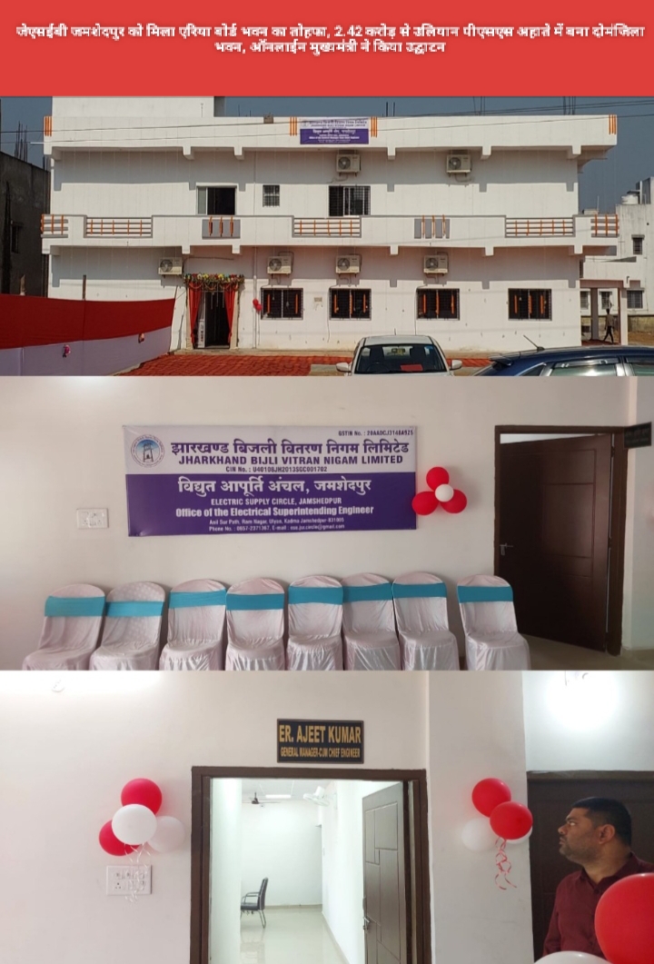 Saraikela (संजीव मेहता) : जेएसईबी (झारखंड राज्य बिजली वितरण निगम) जमशेदपुर को राज्य के रजत जयंती वर्ष के मौके पर एरिया बोर्ड भवन का तोहफा मिला है. जून 2024 से निर्मित भवन का निर्माण 2.42 करोड़ से उलियान पीएसएस अहाते में हुआ है, दोमंजिला भवन बना है, जिसके निचले फ्लोर पर विद्युत अधीक्षण अभियंता का कार्यालय है और पहले तल्ले पर विद्युत महाप्रबंधक (एरिया बोर्ड) का कार्यालय बना है.