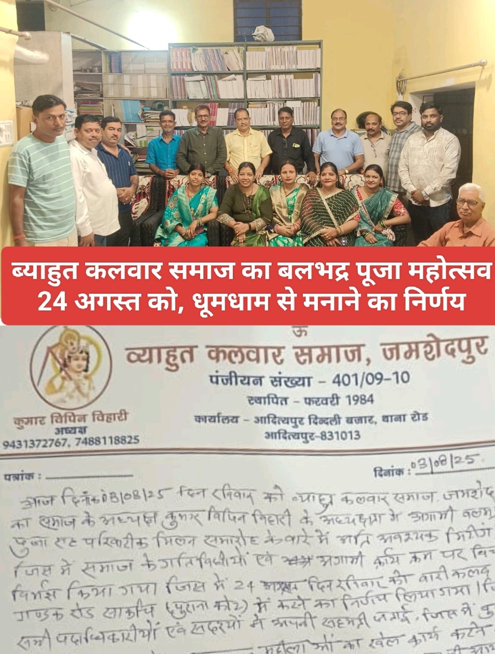 ब्याहुत कलवार समाज जमशेदपुर का वार्षिक बलभद्र पूजन महोत्सव 24 अगस्त को गंडक रोड साकची बारी क्लब में धूमधाम से मनाने का निर्णय लिया गया है. यह निर्णय आज शाम आदित्यपुर में समाज के अध्यक्ष कुमार विपिन बिहारी की अध्यक्षता में हुई बैठक में ली गई है. इस महोत्सव में समाज के पुरुष एवं महिलाओं की पूर्ण भागीदारी रहेगी. बलभद्र पूजन के साथ सांस्कृतिक कार्यक्रम, महिलाओं और बच्चों के बीच खेलकूद और मनोरंजक कार्यक्रम के साथ सुरुचि भोज की भी व्यवस्था रहेगी.