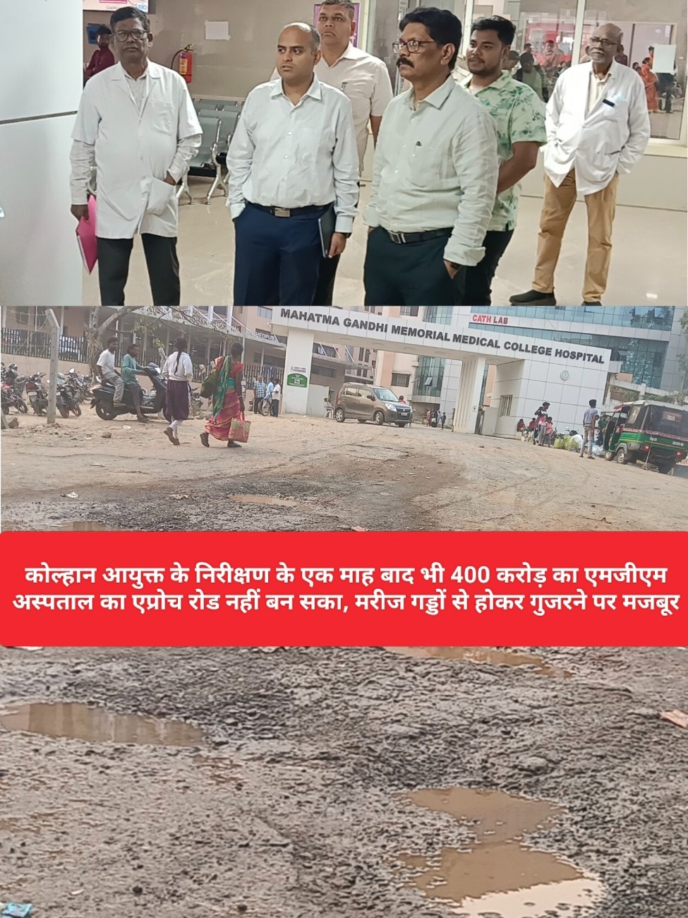 जमशेदपुर :कोल्हान आयुक्त रवि रंजन कुमार विक्रम के एमजीएम अस्पताल का निरीक्षण करने के महीने बाद भी मुख्य सड़क से अस्पताल तक का एप्रोच रोड नहीं बन पाया ऐसे मे 400 करोड़ का अस्पताल बनाने के दौरान कई खामियों में एक एप्रोच सड़क का नहीं बनना भी एक बड़ी लापरवाही या अनदेखी कहा जा सकता है. वैसे आयुक्त के निरीक्षण के दौरान यह बात सामने आई थी कि भवन बनाने के समय ही सड़क बननी चाहिए थी लेकिन पथ विभाग द्वारा निकाला गया टेंडर में विसंगतिया होने के कारण यह सड़क नहीं बन पाया.
