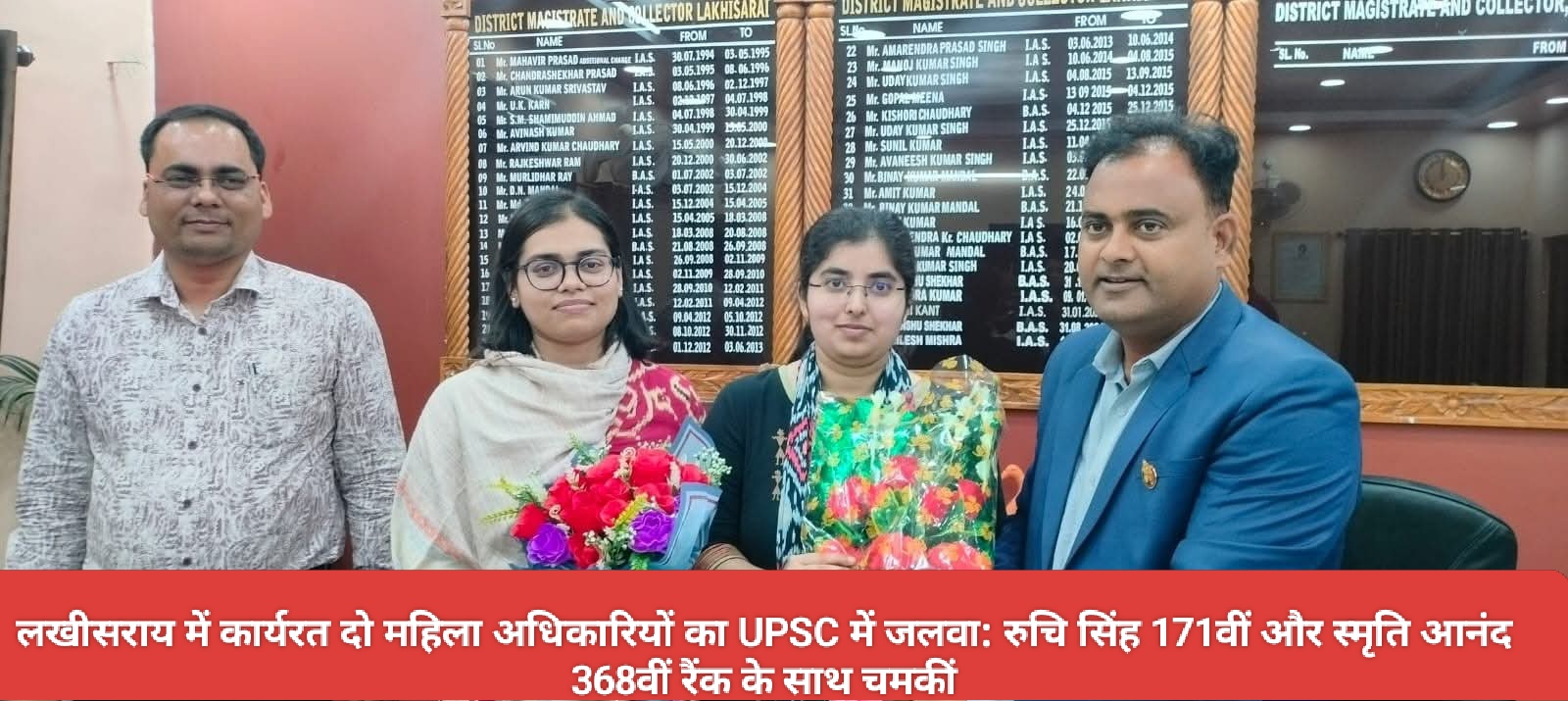 Saraikela (संजीव मेहता) : लखीसराय जिले के लिए शुक्रवार का दिन गर्व का पल लेकर आया. जब लखीसराय में कार्यरत दो महिला पदाधिकारियों ने प्रतिष्ठित UPSC परीक्षा में सफलता हासिल कर प्रशासनिक सेवा में अपनी प्रतिभा का परचम लहराया. इस उल्लेखनीय उपलब्धि पर जिला प्रशासन ने दोनों अधिकारियों को सम्मानित कर उनका उत्साहवर्धन किया. अवर निर्वाचन पदाधिकारी स्मृति आनंद ने UPSC परीक्षा में अखिल भारतीय 368वीं रैंक प्राप्त की, जबकि प्रखंड पंचायत राज पदाधिकारी रुचि सिंह ने 171वीं रैंक हासिल कर शानदार सफलता दर्ज की. दोनों अधिकारियों की इस उपलब्धि से जिला प्रशासन और कर्मियों में खुशी का माहौल है. इस अवसर पर जिला पदाधिकारी मिथिलेश मिश्र ने दोनों सफल अधिकारियों को पुष्प गुच्छ भेंट कर सम्मानित किया और उनके उज्ज्वल भविष्य की कामना की.