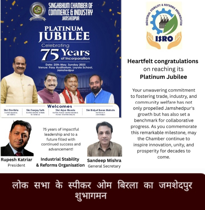 जमशेदपुर : सिंहभूम चैंबर ऑफ कॉमर्स के 75 साल पूरे होने पर इंडस्ट्रियल स्टेबिलिटी एंड रिफॉर्म्स आर्गेनाइजेशन (इसरो ) केंद्रीय मंत्री और संसद की उपस्थिति में कार्यक्रम का आयोजन करेगी.इस कोल्हान क्षेत्र के प्रमुख व्यापारिक संगठन SCCI अपने स्थापना के 75 साल पुरे कर लिया है. 75 साल के लम्बे सफर के इस मुकाम पर आयोजित हो रहे कार्यक्रमों के शुभारंभ करने हेतु मुख्य अतिथि के तौर लोक सभा के स्पीकर ओम बिरला का शुभागमन इस शहर के लिए गौरव की बात होगी.