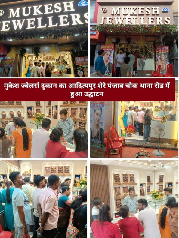 सरायकेला : सरायकेला खरसावां जिले के आदित्यपुर शेरे पंजाब चौक, थाना रोड सतपति होटल के समीप मुकेश ज्वेलर्स का उद्घाटन मुकेश ज्वेलर्स के परिवार के सदस्यों द्वारा समारोह की तरह चारो भाइयों लखविंदर प्रसाद , जगन्नाथ प्रसाद,दिनेश प्रसाद, मुकेश प्रसाद, एवं तनिष्जी प्रसाद सविता देवी आभा रानी, दीपिका, रोशनी देवी आदि परिवार के सदस्यों द्वारा किया गया। उद्घाटन की तैयारीयां कई दिनों से चल रही थी । उद्घाटन के साथ ही 1 अगस्त से पांच अगस्त, यानी, पांच दिनों तक ऑफर चल रहे हैं। कोल्हान प्रमंडल का यह पहला मुकेश ज्वेलर्स,ज्वेलरी दुकान है ,जहां इतना बड़ा ऑफर है।