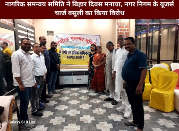 Saraikela (संजीव मेहता) : नागरिक समन्वय समिति के द्वारा बिहार दिवस आज गौरवशाली बिहार दिवस मनाया गया. मौके पर समिति के महासचिव अजीत कुमार ने कार्यक्रम की अध्यक्षता की. वक्ताओं ने बिहार के वैभवशाली अतीत को याद करते हुए उन्नत एवं विकसित बिहार की कामना की. कार्यक्रम के दौरान आदित्यपुर नगर निगम प्रशासन द्वारा कचरा उठाव के लिए प्रति घर से यूजर्स चार्ज के रूप में वसूले जा रहे 80 रुपए पर समिति के लोगों ने कड़ा प्रतिरोध किया. वहीं दूसरी ओर चौक – चौराहों पर फैली गंदगी, नाली जाम, टूटी सड़कों की मरम्मती के लिए आम नागरिकों के साथ मिलकर नगर निगम के विरुद्ध जोरदार आंदोलन करने की रणनीति बनाई गई.