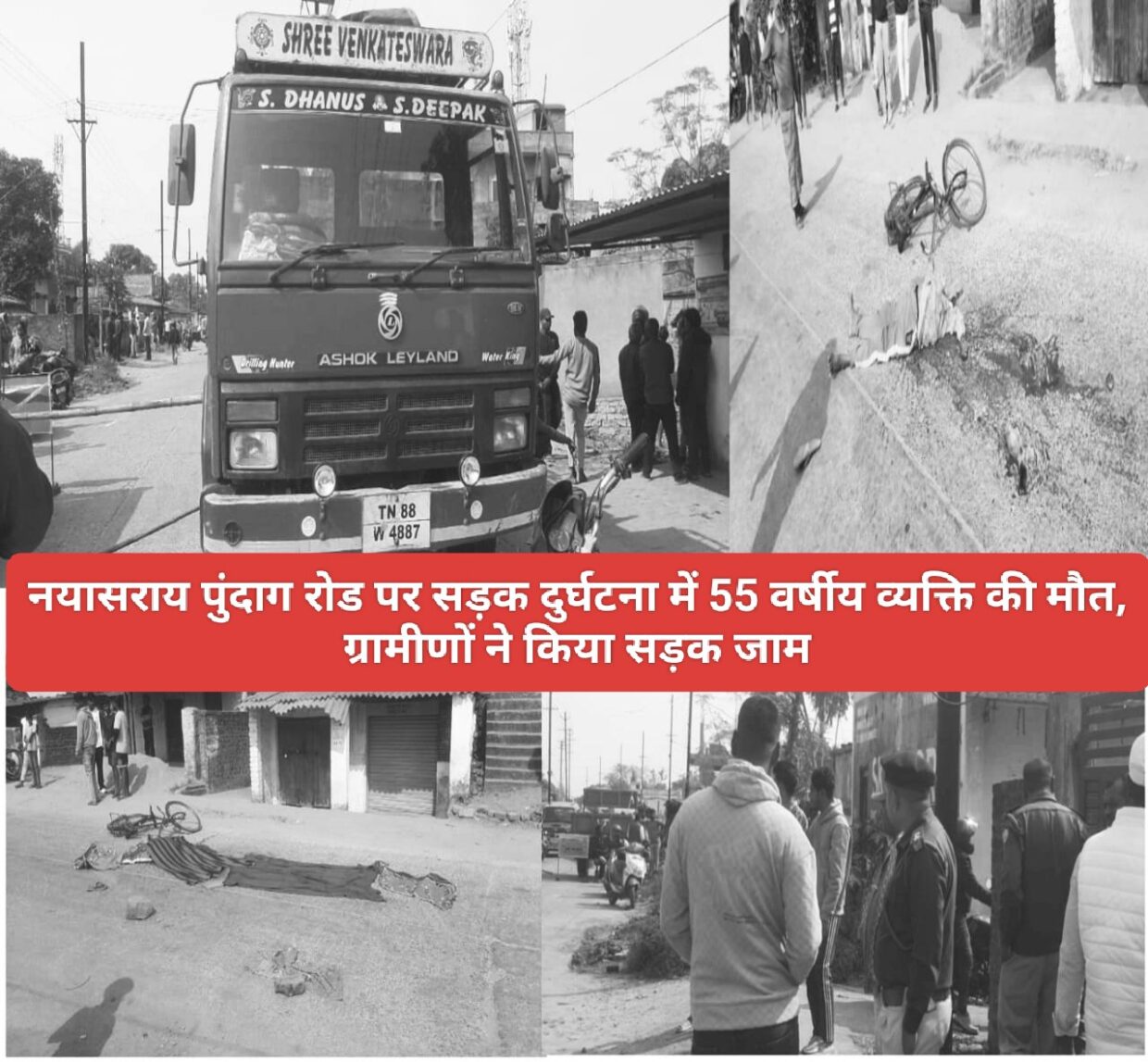 रांची / अमित कुमार : रांची के विधानसभा थाना क्षेत्र के अंतर्गत नयासराय पुंदाग रोड पर एक दर्दनाक सड़क दुर्घटना में 55 वर्षीय व्यक्ति की मौत हो गई। यह घटना तब हुई जब एक बोरिंग गाड़ी (TN88W4887) की चपेट में आने से नयासराय कुटे के निवासी नन्हू बैठा की मौके पर ही मृत्यु हो गई। इस घटना से गुस्साए ग्रामीणों ने पुंदाग रोड पर जाम लगा दिया, जिससे यातायात प्रभावित हुआ। सूचना मिलते ही विधानसभा थाना प्रभारी प्रदीप कुमार राय अपनी टीम के साथ मौके पर पहुंचे। उन्होंने ग्रामीणों को समझा-बुझाकर शांत किया और जाम को हटवाया।