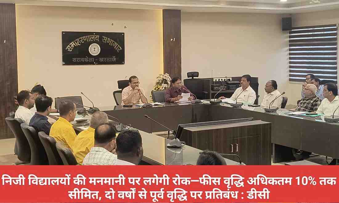 Saraikela (संजीव मेहता) : झारखण्ड शिक्षा न्यायाधिकरण (संशोधन) अधिनियम 2017 के प्रावधानों के अनुपालन में आज समाहरणालय सभागार, सरायकेला–खरसावाँ में जिला स्तरीय शुल्क निर्धारण समिति की प्रथम बैठक उपायुक्त की अध्यक्षता में हुई है. बैठक में क्षेत्र के सांसद प्रतिनिधि, विधायक प्रतिनिधि, जिला शिक्षा पदाधिकारी कैलाश मिश्रा, संबंधित जिला एवं प्रखंड स्तरीय पदाधिकारी, विभिन्न निजी विद्यालयों के प्रधानाचार्य एवं प्रतिनिधि तथा अभिभावक सदस्य उपस्थित रहे. बैठक में निजी विद्यालयों द्वारा शुल्क निर्धारण की प्रक्रिया को पारदर्शी, नियंत्रित एवं न्यायसंगत बनाने, अभिभावकों पर पड़ने वाले अनावश्यक आर्थिक बोझ को कम करने तथा विभिन्न शिकायतों के त्वरित निस्तारण की व्यवस्था सुनिश्चित करने पर विस्तार से चर्चा की गई.