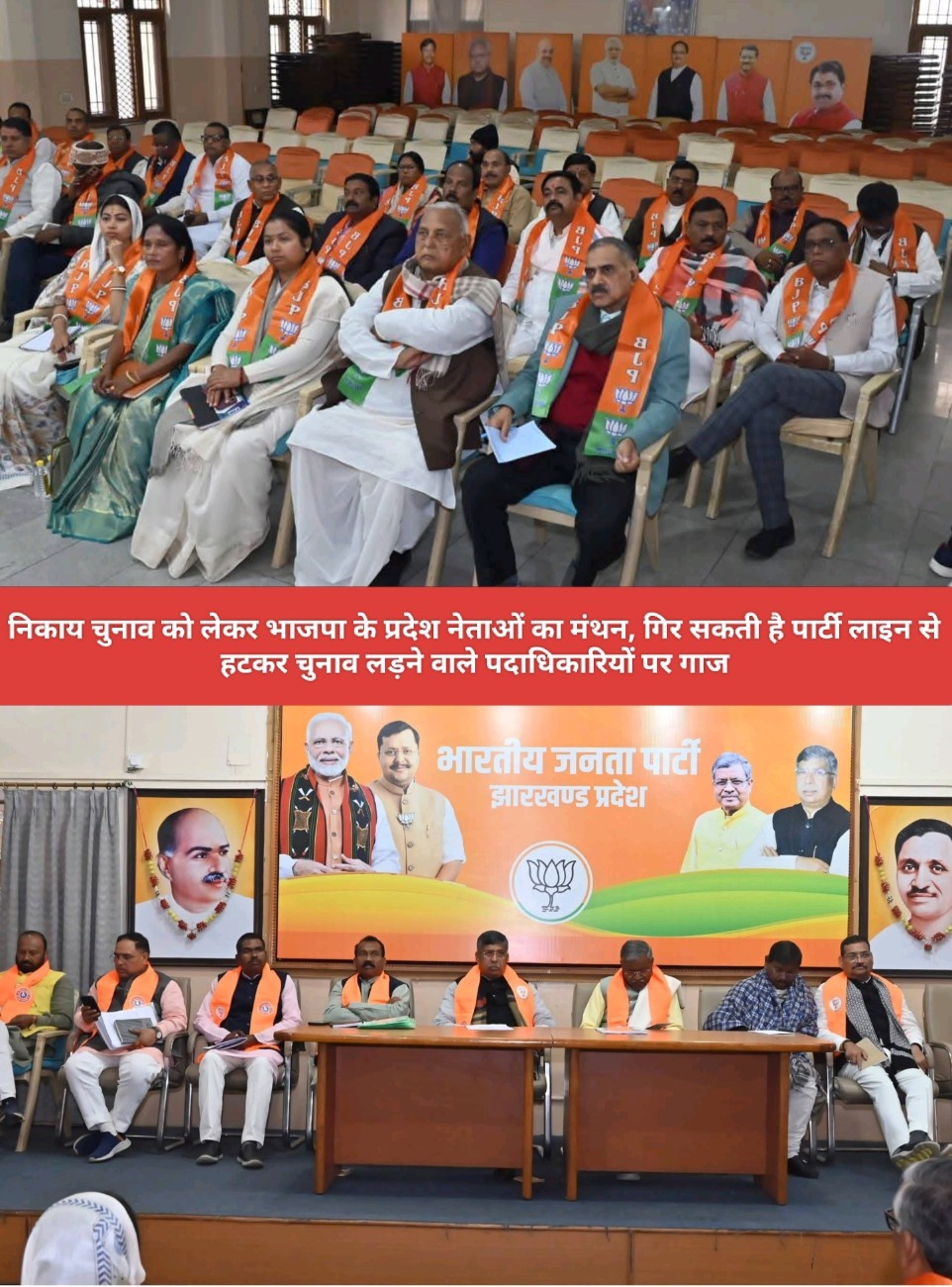 आज की बैठक में वैसे नेताओं पर गाज गिर सकती है. इन्हीं सब बातों को लेकर आज प्रदेश कार्यालय में नगर निकाय चुनाव – 2026 को लेकर महत्वपूर्ण बैठक हो रही है. जिसमें प्रदेश अध्यक्ष आदित्य साहू, नेता प्रतिपक्ष बाबूलाल मरांडी, प्रदेश महामंत्री (संगठन) कर्मवीर सिंह, पूर्व मुख्यमंत्री अर्जुन मुंडा, अनुसूचित जनजाति मोर्चा के राष्ट्रीय अध्यक्ष समीर उरांव, पूर्व प्रदेश अध्यक्ष दीपक प्रकाश तथा प्रदेश उपाध्यक्ष बालमुकुंद सहाय सहित पार्टी के वरिष्ठ नेतागण शामिल रहे.