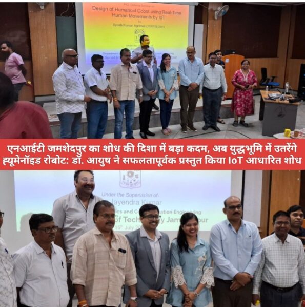 Saraikela (संजीव मेहता) : 15 जुलाई 2025 को एनआईटी जमशेदपुर के इलेक्ट्रॉनिक्स एवं संचार इंजीनियरिंग विभाग में डॉ. आयुष कुमार अग्रवाल ने अपने पीएच.डी. शोध “IoT आधारित वास्तविक समय मानव गति पर आधारित ह्यूमेनॉइड कॉबोट का डिज़ाइन” का डिफेन्स सेमिनार सफलतापूर्वक प्रस्तुत किया. यह शोध मील का पत्थर साबित होगा. यह शोध चार वर्षों के कठोर अनुसंधान का परिणाम है, जिसमें मानव गति को समझकर रोबोट को वास्तविक समय में नियंत्रित किया गया. इस शोध में IMU सेंसर MPU9250, जेस्चर रिकग्निशन एल्गोरिद्म और IoT आधारित एज कंप्यूटिंग का उपयोग हुआ. यह तकनीक रक्षा, औद्योगिक स्वचालन और चिकित्सा क्षेत्र में क्रांतिकारी साबित हो सकती है. मौके पर बाह्य परीक्षक के रूप में एम.ए.एन.आई.टी. भोपाल के प्रो. आर.एन. यादव उपस्थित थे, जिन्होंने शोध की गहराई की सराहना की. एसआरसी पैनल ने भी शोध को उत्कृष्ट बताते हुए इसे मान्यता दी.