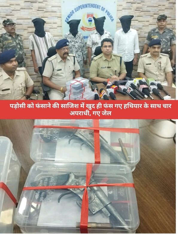 जिसके बाद एक टीम गठित कर थाना प्रभारी राजन कुमार घटना स्थल पर पहुंचे जहां अनुसंधान में पाया की राजा यादव का अपने पड़ोसी के साथ विवाद चल रहा है,जिसे लेकर घटना के रात्रि राजा के घर ने वीर सिंह उर्फ पंडित,रवि कुमार राव और विक्की सिंह गिल उर्फ कुंडी ने बैठक कर एक साजिश रची और घर में दो खोखा रख कर झूठा अफवाह फैलाया गया कि कुछ युवकों ने फायरिंग की घटना को अंजाम देकर फरार हो गए है,जो अनुसंधान में गलत साबित हुई और चारों से कड़ाई से पूछताछ करने पर पूरे मामले का उद्भेदन हुआ,वही इनके पास दो देशी कट्टा,दो गोली और चापड़ बरामद किया गया।सिटी एसपी ने बताया कि गिरफ्तार अपराधियों में राजा,वीर सिंह और विक्की पर कई अपराधिक मामले दर्ज है।सभी से आवश्यक पूछताछ के बाद न्यायिक हिरासत में भेज दिया गया।